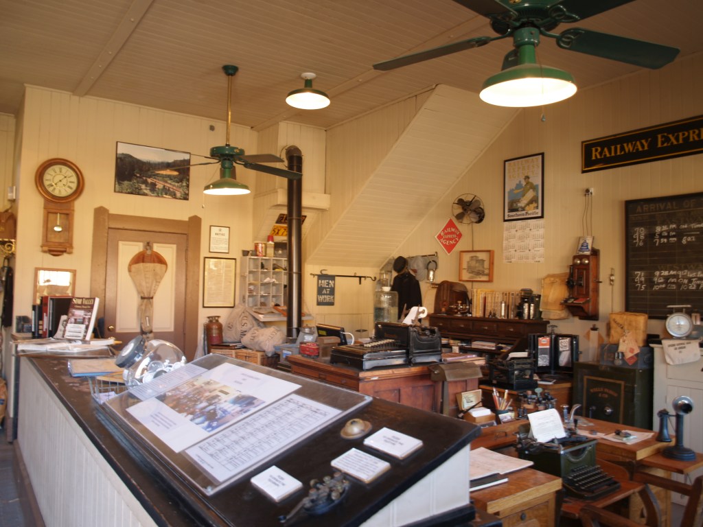 Ticket sales and waiting room.The other side of the ticket window. The hub of the depot, ticket sales, dispatch, telegraph office.Note the mail bag hanging on the door; the train slowed but didn’t need to stop to pick up mail.