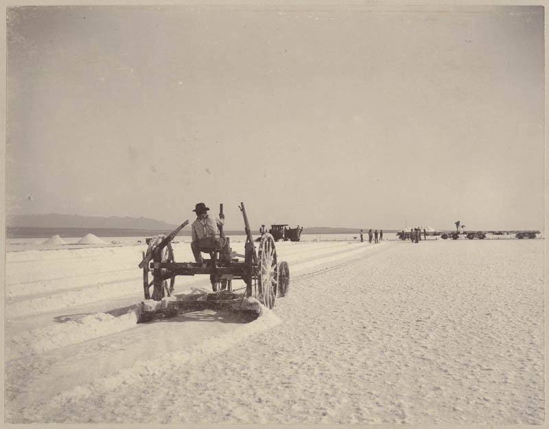 “The sight at the salt works is an interesting one, for thousands of tons are piled up like huge snow drifts,…Indians operate cable plows, harvesting over 700 tons of pure salt per day. A portable railroad conveys the salt to the works.