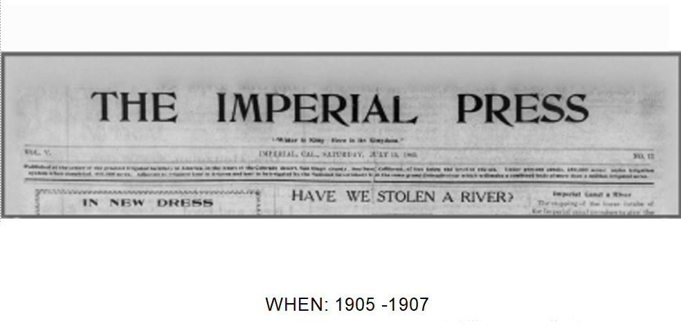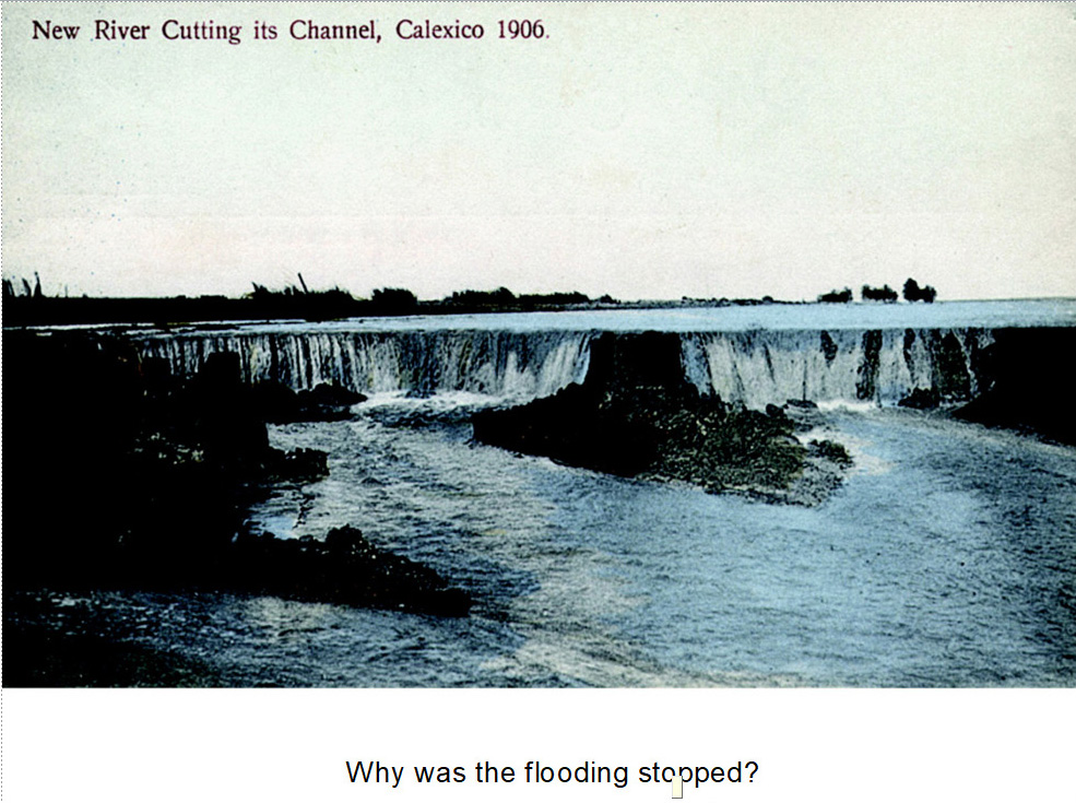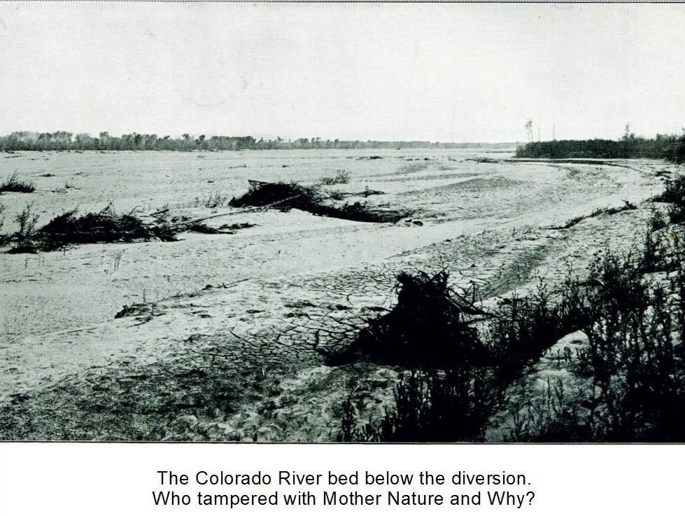 In autumn 1904, the California Development Company cut an opening in the Colorado River bank, four miles south of the US/Mexican border, to send irrigation water via an earthen canal to farms in Imperial Valley. By April 1905, major floods on the Colorado proved more than makeshift dams could handle, and the river diverted course to the site of the Salton Sea.